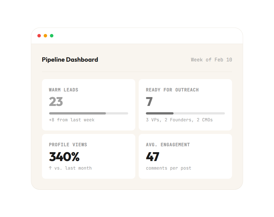 Every week you get a report showing exactly who’s engaging, what stage they’re at, and who’s ready for direct outreach. Pipeline intel, not impressions.